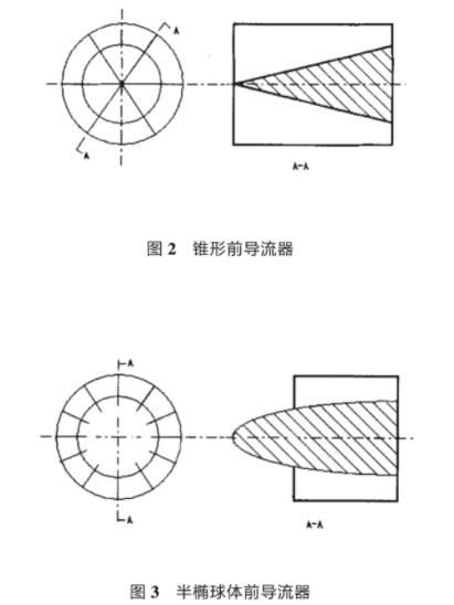 圖2和(hé)圖3分别爲兩(liǎng)種結構的前(qian)導流器示意(yì)圖。圖2爲渦輪(lún)流量計常用(yong)結構,葉片數(shu)爲6導流.體形(xing)狀由流入至(zhì)流出呈錐形(xíng),葉片長與錐(zhuī)體高度相同(tóng).圖3爲本🛀文改(gai)進的前導流(liu)器結構示意(yì)圖其主🧡要特(te)點是将錐體(tǐ)改爲半橢球(qiu)體,葉片數增(zēng)加到12并把葉(yè)片長度縮小(xiǎo)1/3.