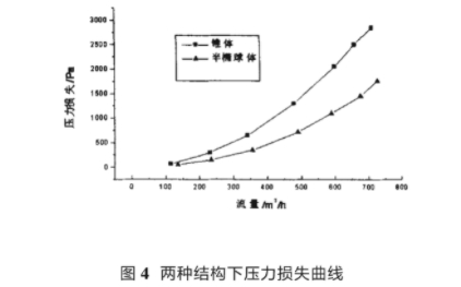 圖4是兩種結(jie)構下,流體經(jing)過流量計後(hou)的壓力損失(shī)曲♋線。由💔圖4可(ke)看出在流量(liang)<100m³/h時,壓力損失(shi)不受導流器(qì)結構的影響(xiang)而且壓損很(hěn)小。随着流量(liang)增大,改進的(de)⭐導流器的壓(ya)損明顯低于(yu)錐體導流器(qì)在最大流量(liang)600m³/h處錐體的壓(yā)損約爲半橢(tuǒ)球體的2倍,可(ke)見導流器的(de)結構對流量(liang)計壓力損失(shi)有不容忽視(shi)✨的影響作用(yong)🌍。
