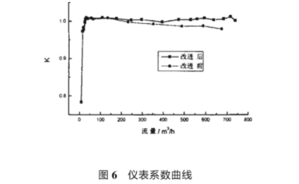 圖6爲分别(bié)采用錐體和(hé)半橢球體導(dao)流器,流量計(ji)儀表系數♍的(de)⭐測試結果。由(yóu)圖可看出采(cai)用改進的導(dǎo)流器後流量(liang)計儀表系數(shu)比改進前有(yǒu)較好地改善(shàn)在量程範圍(wei)内50m³/h~600m³/h),K很好地體(tǐ)🏃♂️現常系數的(de)特性甚至在(zai)超過最大量(liang)程後能繼續(xù)保持水♈平直(zhí)線狀态。改進(jin)前的流量計(jì)K值也較好,但(dàn)随着流量增(zēng)大直線略向(xiang)下傾斜偏離(li)了水平位置(zhì)。