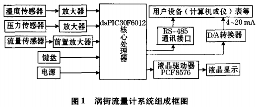 根據渦街流(liu)量計的特點(dian)和數字信号(hao)處理的運算(suàn)🈲要求🈚,選擇了(le)dsPIC30F6012單片機作爲(wei)核心部件,它(ta)是一種16位微(wēi)處理器。其内(nei)部集成有1個(ge)16位CPU和1個DSP内核(hé),當内部時鍾(zhong)頻率爲最高(gāo)120MHz時,進行1次16bitx16bit運(yun)算爲8.3ns等特點(dian)❓。系統組成主(zhǔ)要包括:檢測(ce)電路、放大電(diàn)路、顯示電路(lu)、通信接口電(dian)🔴路等,其系統(tǒng)組成框圖如(ru)圖1所示。渦街(jie)🌐傳感器采集(ji)❗流量信号,壓(yā)力、溫度傳感(gǎn)器采集流體(tǐ)溫度、壓力信(xìn)㊙️号對流量信(xìn)号加以實時(shi)補償和修正(zhèng)。