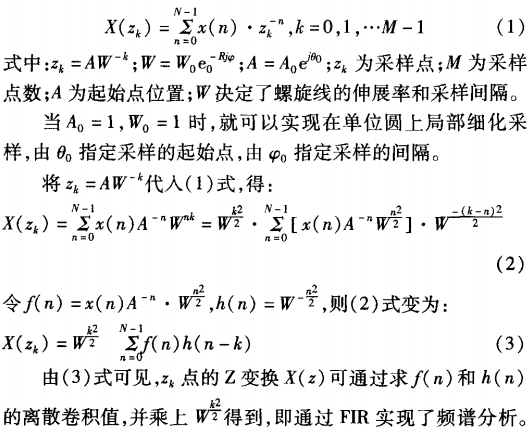 N點FFT計算的(de)頻譜實際上(shang)是Z平面單位(wèi)圓上的N點等(deng)間隔采樣,Chirp-Z變(biàn)換(即CZT)是Z平面(miàn)螺旋線周線(xian)上Z變換的等(děng)間隔取樣,這(zhe)些取樣在螺(luo)旋線的某--部(bù)分上按等角(jiǎo)度分布。具體(tǐ)地說,令x(n)表示(shì)N點序列,X(z)表示(shì)其🤩Z變換,而利(li)用💃CZT算法,可以(yǐ)計算給定點(dian)z的X(z),N點x(n)的🥵Chirp-Z變換(huàn)爲: