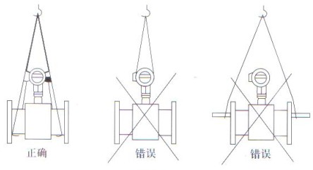 在搬運和(hé)吊裝傳感器(qi)時,應該将吊(diao)索套在傳感(gan)器兩端😘頸☀️部(bu)位置或吊環(huan)上,切勿在測(ce)量管内套入(ru)管🧑🏾🤝🧑🏼棒進行吊(diao)裝,以免損壞(huài)襯裏(見圖)。在(zài)吊裝和搬運(yùn)電磁流量😘計(ji)過程中,必須(xu)防止傳感器(qì)襯📱裏和接線(xiàn)盒受碰撞而(ér)🌈損壞。