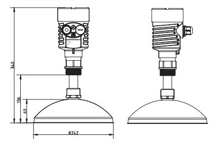 SKD58抛物面雷達物位(wei)計測量最大距離(li)可達80米。天線被進(jìn)一步優化處理,新(xin)型的快速的微處(chu)理器可以進行更(gèng)高速率的信号分(fen)析處理🙇♀️,使得儀表(biao)可以用于如:反應(yīng)釜或固體料倉非(fei)常✨複雜的測量條(tiáo)件。 原理 抛物面雷(lei)達物位計天線發(fā)射較窄的微波脈(mo)沖,經天線向下傳(chuán)輸,微波接觸到被(bei)測介質表面後被(bei)反射回來,再次被(bèi)天線系統接收并(bing)将其傳輸給電子(zǐ)線路部分自動轉(zhuan)換成👅物位信🎯号。(因(yin)爲微波傳播速度(du)極快,電磁波到達(dá)目标并經❗反射返(fǎn)回接收器這🔴一來(lai)回所用的時間幾(ji)乎是瞬間的) SKD58抛物(wu)面雷達物位計參(cān)數 應??用:固體料、過(guo)程容器或強粉塵(chén)易結晶、結露場合(he) 測量範圍:80米 過程(chéng)連接:螺紋、法蘭 介(jiè)質溫度:-40~250℃ -60~400℃ 過程壓力(lì):常壓 精??度:±15mm 頻率範(fàn)圍:26GHz 防爆等級:Exb IIBT4 Gb 防護(hu)等級:IP67 信号輸出:4~20mA/HART(兩(liang)線/四線)RS485/Modbus SKD58抛物面雷(lei)達物位計外型尺(chi)寸圖