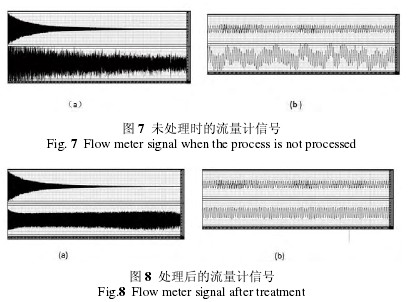 由于(yú)渦街流(liú)量計容(róng)易與數(shù)字電子(zǐ)設備配(pei)套使用(yòng),所以是(shì)一種比(bǐ)較先進(jìn)、理想的(de)測量儀(yí)器。漩渦(wo)升力與(yǔ)流量的(de)平方呈(cheng)正比、與(yu)流體的(de)密度呈(cheng)正比。因(yin)此,當小(xiao)流量、低(di)流速或(huo)大流量(liang)、高流速(su)的時候(hou),對渦街(jiē)流量計(ji)提出了(le)比較高(gāo)的要求(qiú)。針對這(zhè)個問題(ti),本文做(zuò)了相應(ying)的探讨(tao)。爲了使(shǐ)渦街流(liu)量計盡(jin)可能測(cè)量低流(liú)速、小流(liú)量,必須(xū)提高信(xìn)噪比,采(cǎi)用差動(dong)壓電傳(chuan)感器和(he)差動放(fàng)大電路(lù),盡量提(tí)高有效(xiào)流量信(xin)号的幅(fú)值而降(jiang)低機械(xie)振動幹(gàn)擾信号(hào)的幅值(zhi)。針對高(gāo)流速、大(da)流量産(chan)生漏波(bo)現象的(de)問題,采(cai)用頻譜(pǔ)分析和(he)動态濾(lü)波的方(fāng)法,盡量(liang)減少漏(lou)波現象(xiàng)。圖 7 爲未(wèi)處理時(shi)流量計(ji)輸出的(de)傳感器(qi)信号和(he)放大器(qi)輸出信(xin)号。圖 7(a)上(shang)部爲傳(chuan)感器輸(shū)出的原(yuan)始信号(hào),下部爲(wei)放大器(qì)輸出信(xìn)号;圖 7(b)爲(wei)展開的(de)視圖。圖(tu) 8 爲處理(li)後流量(liàng)計輸出(chū)的傳感(gan)器信号(hào)和放大(dà)器輸出(chu)信号。圖(tú) 8(a)上部爲(wei)傳感器(qi)輸出的(de)原始信(xin)号,下部(bu)爲放大(dà)器輸出(chū)信号;圖(tu) 8(b)爲展開(kāi)的視圖(tu)。