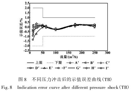 TB每次經過(guo)高壓氣體沖(chong)擊後再進行(háng)常壓檢定的(de)示💞值誤差曲(qu)線如圖8所示(shì)。