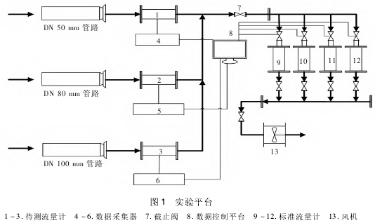 本文實(shi)驗平台是在(zai)流量計标準(zhǔn)檢定平台基(jī)礎.上改進搭(da)建的,增加壓(yā)差采集模塊(kuai),實現壓差與(yǔ)既有參數同(tong)步采集。實驗(yàn)平台見圖1。實(shí)驗平台設置(zhi)4台标準流量(liàng)計,均爲羅茨(cí)流量計,4台标(biao)準流量計的(de)流量範圍不(bú)同,通過不同(tong)标準流量計(jì)組合來提供(gong)測試所需的(de)流量範圍。數(shù)據采集器是(shi)溫度、壓力、流(liú)量、壓差傳感(gan)器的集合。選(xuǎn)用數字壓差(chà)傳感器,測量(liàng)範圍爲-6~6kPa,精度(dù)高于0.3%。