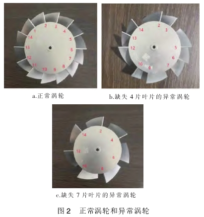正常(chang)流量計的渦(wō)輪葉片有14片(pian),制作葉片缺(que)失4片和缺失(shi)7片的異常渦(wo)輪,置于流量(liàng)計内,進行對(dui)比實驗。正常(chang)渦輪和異常(cháng)渦輪見圖2。實(shi)驗過程中渦(wō)輪拆除更換(huàn)均由專業技(jì)術人員操作(zuo)。