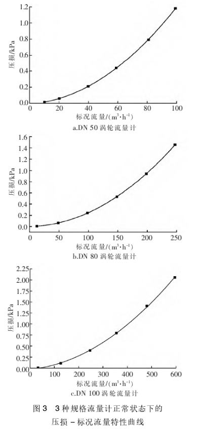 通過(guo)上述分析可(ke)以看出,渦輪(lun)流量計的壓(ya)損與标況流(liú)量成二次函(hán)數關系。當渦(wō)輪流量計異(yì)常時,壓損-标(biao)況流量特性(xing)曲線将偏離(li)正常曲線。