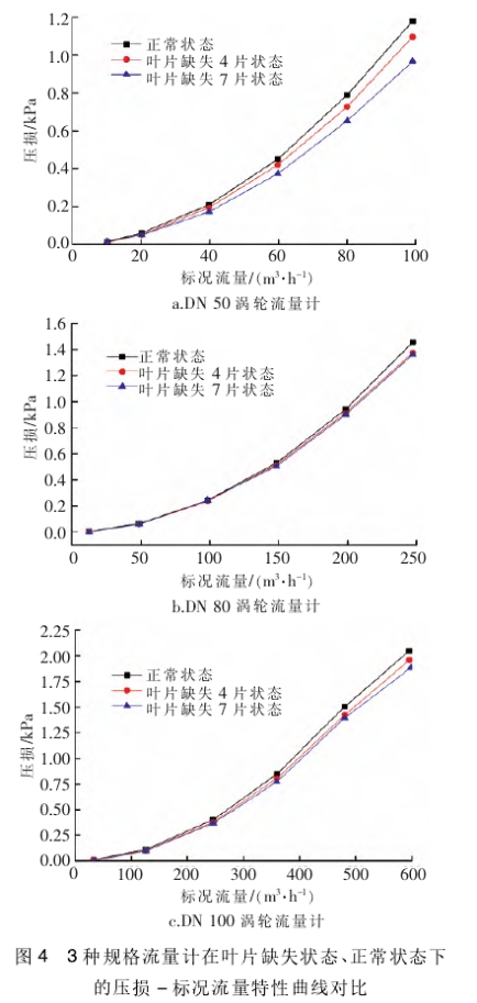 圖4爲(wèi)DN50、DN80、DN100渦輪流量計(jì)葉片缺失4片(pian)狀态、葉片缺(quē)失7片狀态與(yǔ)正常狀态的(de)壓損-标況流(liu)量特性曲線(xiàn)對比。可以看(kan)出,對每種規(gui)格的渦輪流(liú)量計,在相同(tóng)流量情況下(xia),葉片缺失狀(zhuàng)态的壓損比(bǐ)正常狀态小(xiǎo),葉片缺失越(yue)多,壓損越小(xiǎo)。壓損減小值(zhí)随着流量增(zeng)大而增大,小(xiǎo)流量下的壓(ya)損減小值難(nán)以識别,大流(liu)量下的壓損(sǔn)減小值也不(bu)顯著,但.當流(liu)量足夠大時(shi),采用工業級(jí)别壓差傳感(gan)器可以識别(bié)。在實際運行(háng)中,由于大流(liú)量下的壓損(sǔn)減小值不顯(xian)著,可能導緻(zhì)較多誤判,因(yin)此需要結合(hé)流量計的高(gao)低頻脈沖數(shù)進一步判定(ding)。