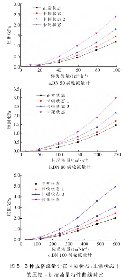 圖5爲(wèi)DN50、DN80、DN100渦輪流量計(jì)卡頓狀态、正(zheng)常狀态的壓(yā)損-标況流量(liàng)特性曲線對(dui)比。可以看出(chū),對每種規格(gé)的渦輪流量(liàng)計,當軸處于(yú)卡頓狀态時(shí),相對于正常(chang)狀态,相同流(liu)量下的壓損(sun)變大,卡頓程(chéng)度越大,壓損(sun)越大;壓損增(zeng)大值随着流(liú)量增大而增(zēng)大。卡死狀态(tai)與正常狀态(tài)相比,壓損顯(xiǎn)著增大,最大(dà)流量下DN50、DN80、DN100渦輪(lun)流量計的壓(ya)損分别爲正(zheng)常狀态下壓(yā)損的2.0、2.1、2.4倍。